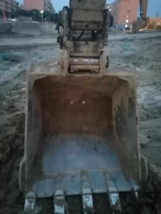 首先找一個(gè)平整的場地,把挖機(jī)開過去,當(dāng)然挖斗也要帶去。把挖斗放好,如圖。