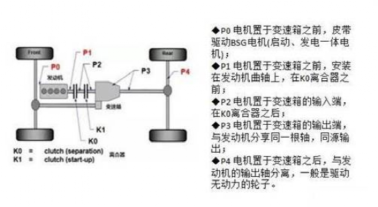 這里提一下當(dāng)前主流的混動(dòng)布局,其根據(jù)電機(jī)位置可以分為P0、P1、P2、P3、P4結(jié)構(gòu),如下圖: