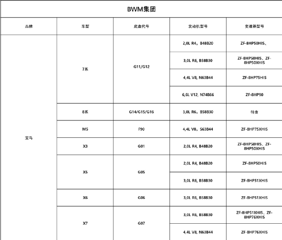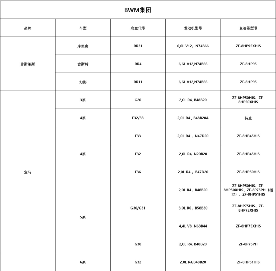 目前裝備ZF 8AT系列變速器有多個(gè)品牌,其中BMW集團(tuán)包括:寶馬3系、寶馬5系、寶馬4系、寶馬7系、寶馬8系寶馬Z4;寶馬X7、寶馬X6、寶馬X5、寶馬X4、寶馬X3、寶馬X1(2.0T頂配車型)、寶馬X2(2.0T頂配車型)、寶馬6系GT、寶馬3系GT、寶馬M部門車型全系、勞斯萊斯全系車型。