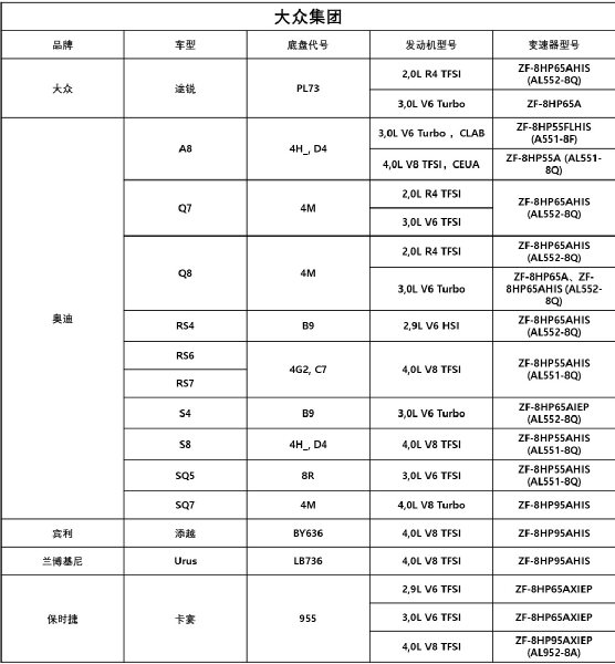 大眾集團(tuán)旗下多個(gè)汽車牌子的頂級(jí)高端轎車和豪華SUV,都在使用采埃孚8AT,其中大眾品牌有途銳;奧迪品牌包括奧迪Q7、奧迪Q8、奧迪A8、奧迪S4、奧迪S5、奧迪S6、奧迪S7、奧迪S8、奧迪SQ5、奧迪RS4、奧迪RS5、奧迪RS6、奧迪RS7、奧迪 RS Q8;保時(shí)捷品牌有卡宴;賓利品牌賓利添越;蘭博基尼品牌有Urus。