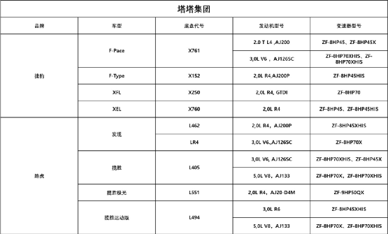塔塔集團(tuán)包括捷豹以及路虎也均有車型在使用ZF 8AT,具體而言,捷豹品牌包括捷豹XFL、捷豹捷豹XEL、捷豹F-PACE、捷豹F-TYPE;路虎品牌包括路虎攬勝、路虎衛(wèi)士、路虎攬勝星脈、路虎攬勝運(yùn)動(dòng)版、路虎發(fā)現(xiàn)。