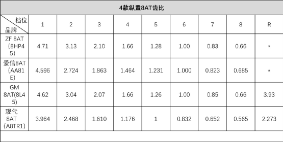 ZF 8AT的齒比范圍在7.07:1,愛(ài)信8AT的齒比范圍在6.71:1,通用的8AT齒比范圍在7.7:1,現(xiàn)代8AT速比范圍在7.01:1。
