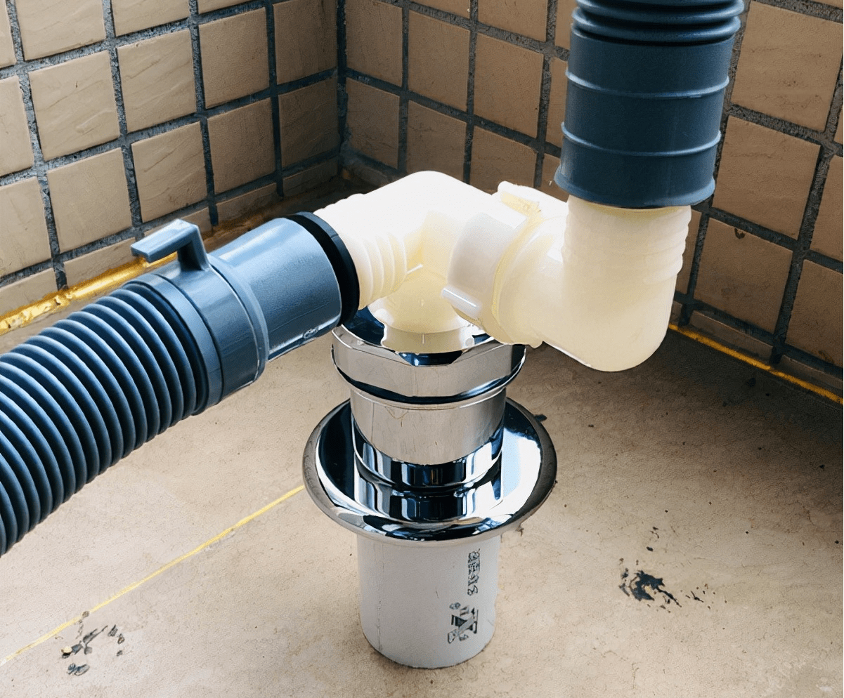 多了一根三個口的塑料管,包含兩個固定膠條和一個硅膠密封圈,以及一個硅膠防臭芯。有了它,就可以從兩個方向同時排水了。地漏排水要改造,沒有使用豎管排水的條件,又該怎么辦呢?如果不得不用地漏排水,我們就只能對地漏進行改造了。前面我們說了,用地漏排水時會遇到兩個問題:溢水和反味。