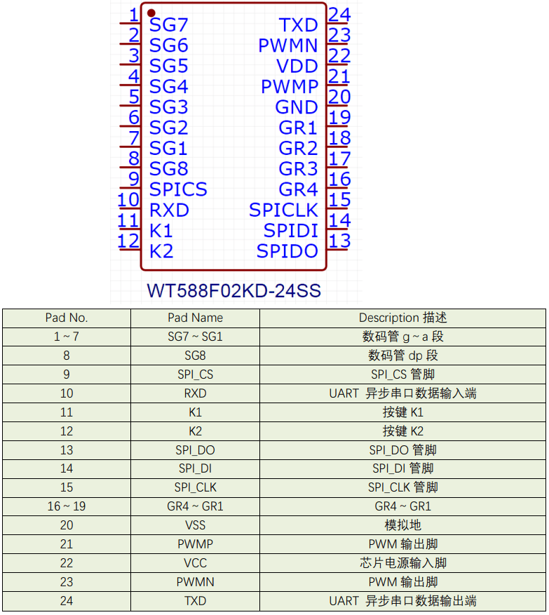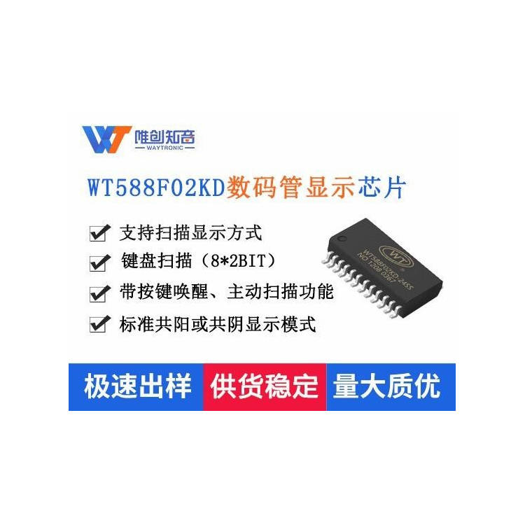 WT588F02KD-24SS(SSOP24 封裝)是一種帶鍵盤掃描接口 LED(4 位 LED 數(shù)碼管) 的驅動控制,帶語音播報功能的專用芯片。芯片內(nèi)部可以容納最大 200 秒的語音內(nèi)容。芯片 內(nèi)部還集成 MCU 可擴展功能、LED 數(shù)碼管驅動接口、鍵盤掃描接口等。本產(chǎn)品可以應用于電磁爐、微波爐及小家電產(chǎn)品的顯示屏驅動語音播報電路。