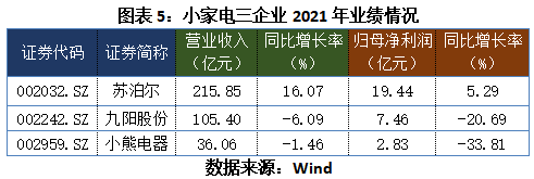其中,小家電三大龍頭企業(yè)蘇泊爾(54.240, -0.11, -0.20%)(002032.SZ)、九陽(yáng)股份(14.930, -0.04, -0.27%)(002242.SZ)、小熊電器(51.810, -0.15, -0.29%)(002959.SZ)均發(fā)布了2021年年報(bào)。