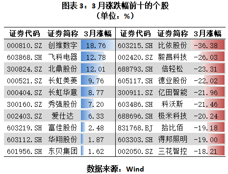 從個(gè)股表現(xiàn)來(lái)看,3月漲幅前三的家電企業(yè)分別為創(chuàng)維數(shù)字(13.710, 0.19, 1.41%)(18.76%)、飛科電器(64.940, 2.12, 3.37%)(12.78%)、北鼎股份(11.150, 0.49, 4.60%)(12.01%),跌幅前三的家電企業(yè)分別為比依股份(18.250, 0.18, 1.00%)(-36.38%)、毅昌科技(5.270, 0.18, 3.54%)(-26.03%)、倍輕松(50.310, 1.31, 2.67%)(-23.31%)。