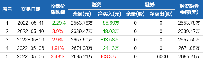 融資方面,當(dāng)日融資買入118.78萬元,融資償還204.48萬元,融資凈償還85.69萬元,連續(xù)4日凈償還累計141.44萬元。融券方面,融券賣出0股,融券償還0股,融券余量0股,融券余額0元。融資融券余額合計2553.78萬元。