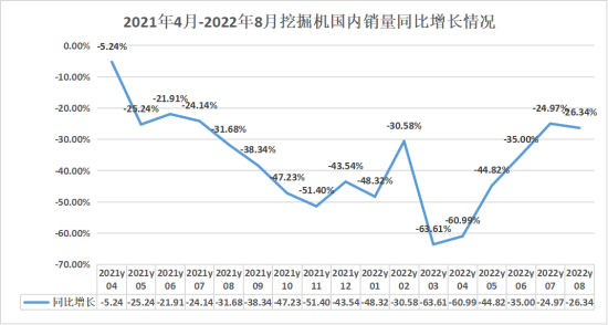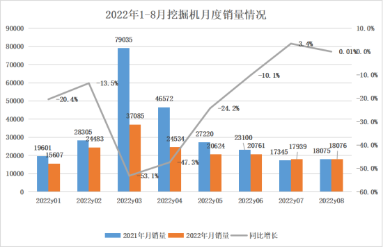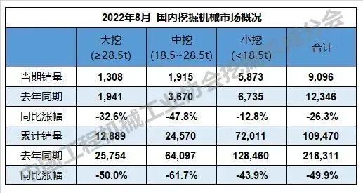 根據(jù)中國工程機械工業(yè)協(xié)會行業(yè)統(tǒng)計數(shù)據(jù),2022年8月,納入統(tǒng)計的26家主機制造企業(yè)共銷售各類挖掘機18076臺,與去年同期持平(去年18075臺)。其中,國內(nèi)市場銷量9096臺,同比下降26.3%;出口銷量8980臺,同比增長56.7%。
