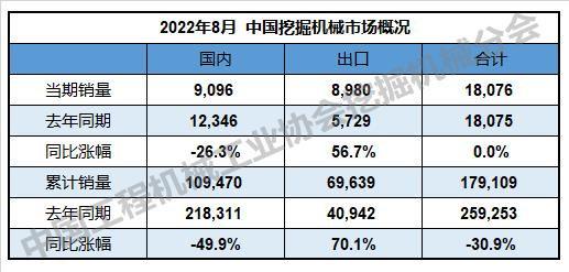 2022年8月,共計(jì)銷售各類挖掘機(jī)械產(chǎn)品18,076臺(tái),與去年同期持平。其中,國(guó)內(nèi)市場(chǎng)銷量9,096臺(tái),同比下降26.3%;出口銷量8,980臺(tái),同比增長(zhǎng)56.7%。