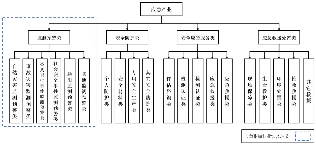 我國的公安應(yīng)急指揮體系作為城市群實施應(yīng)急指揮功能的有機整體,包括應(yīng)急指揮人員、應(yīng)急指揮機構(gòu)和應(yīng)急指揮手段。公安應(yīng)急指揮系統(tǒng)深度融合云計算、大數(shù)據(jù)分析、人工智能、物聯(lián)網(wǎng)等多種先進信息技術(shù),承擔(dān)接警處警、收集報送信息、綜合警情研判、全面協(xié)調(diào)調(diào)度、聯(lián)動黨政軍警以及社會力量等多種重要職能。根據(jù)《安全應(yīng)急產(chǎn)業(yè)分類指導(dǎo)目錄(2021年版)》,公安應(yīng)急指揮系統(tǒng)應(yīng)急產(chǎn)業(yè)結(jié)構(gòu)中所處環(huán)節(jié)如下: