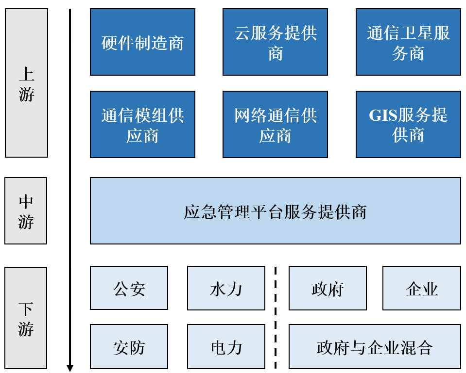 產(chǎn)業(yè)鏈方面,應(yīng)急平臺產(chǎn)業(yè)上游供應(yīng)商包括硬件制造商、云服務(wù)提供商、通信衛(wèi)星服務(wù)商等,各細(xì)分領(lǐng)域內(nèi)技術(shù)演變迭代快,總體競爭激烈;產(chǎn)業(yè)下游終端領(lǐng)域包括公安,安防、水利等,主要客戶類型分為政府客戶、政府及企業(yè)客戶混合客戶、企業(yè)客戶。具體產(chǎn)業(yè)鏈圖譜如下:
