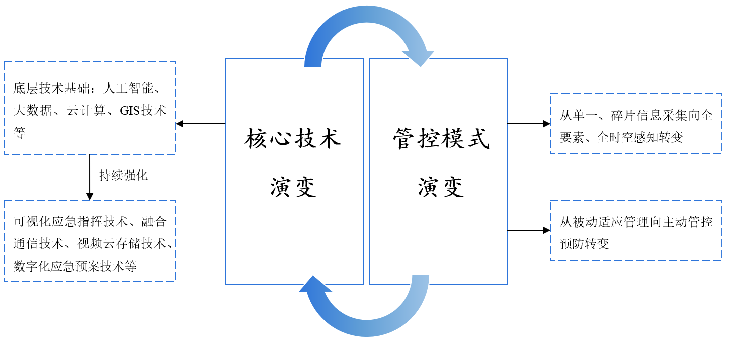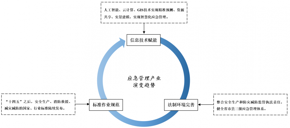 2018年12月,應(yīng)急管理部印發(fā)《應(yīng)急管理信息化發(fā)展戰(zhàn)略規(guī)劃框架(2018-2022)》(以下簡稱《規(guī)劃》),作為推動我國應(yīng)急管理信息化工作的根本指南。在產(chǎn)業(yè)政策的深度推動下,我國應(yīng)急管理產(chǎn)業(yè)向信息技術(shù)高度耦合、法制環(huán)境逐步完善、流程作業(yè)持續(xù)規(guī)范不斷演變,共同推動系統(tǒng)整體性、智能性、協(xié)同性不斷提升。