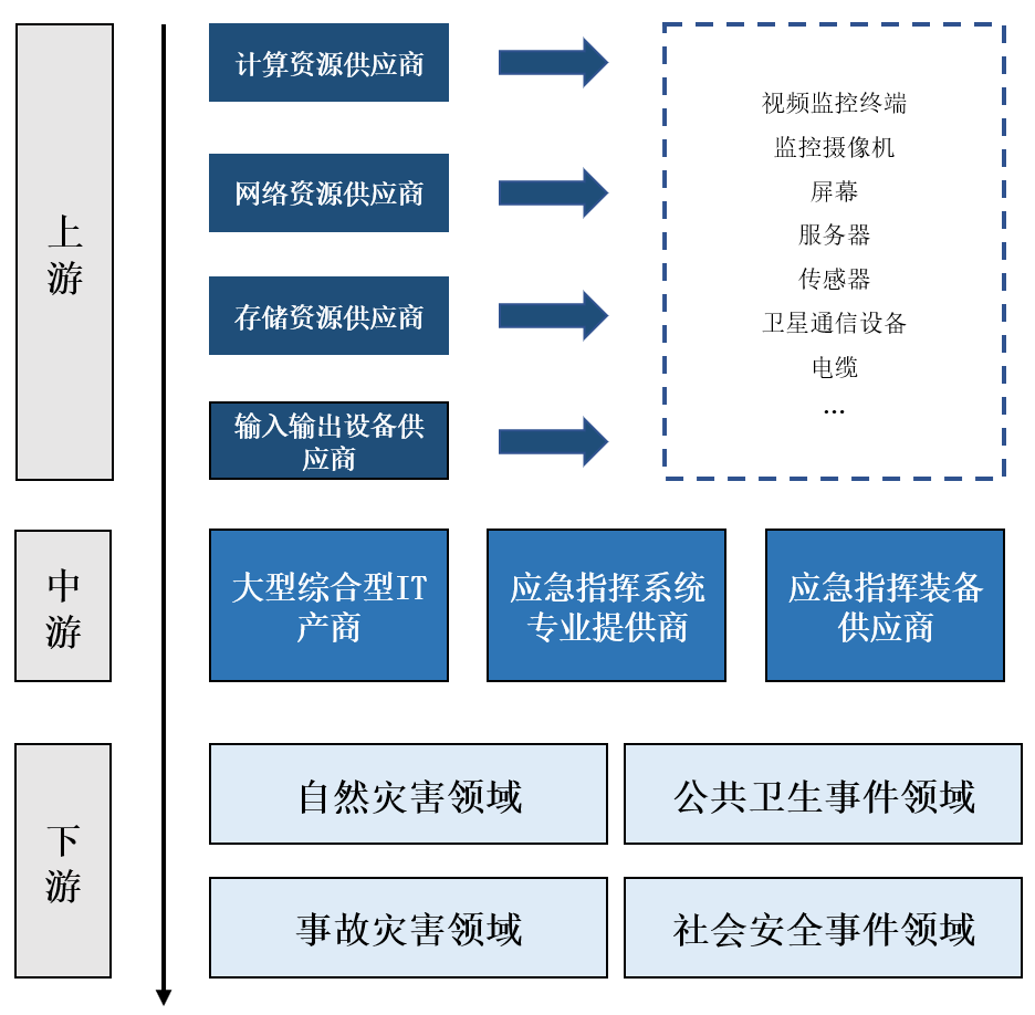 產(chǎn)業(yè)鏈方面,行業(yè)上游主要是計算資源供應(yīng)商、網(wǎng)絡(luò)資源供應(yīng)商、存儲資源供應(yīng)商及各式輸入輸出設(shè)備供應(yīng)商等,提供系統(tǒng)所需的各種軟硬件。目前,上游各產(chǎn)業(yè)技術(shù)相對成熟,國產(chǎn)率較高,市場競爭較為充分。下游方面,公安應(yīng)急指揮系統(tǒng)可應(yīng)用于自然災(zāi)害、公共衛(wèi)生事件、事故災(zāi)害、社會安全事件等多個領(lǐng)域。