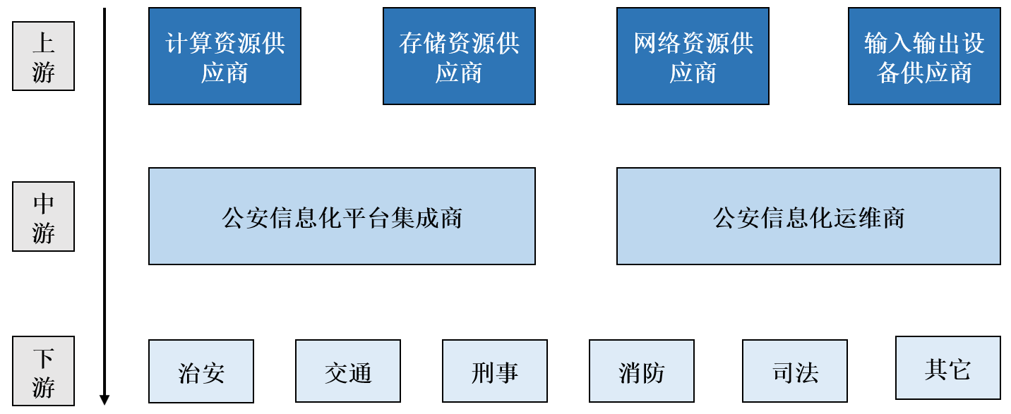 產(chǎn)業(yè)鏈方面,行業(yè)的上游主要為各類軟硬件提供商,目前,其各細(xì)分市場已基本成熟,市場競爭較為充分;產(chǎn)業(yè)下游需求方主要為公安系統(tǒng)中的各細(xì)分警種,包括治安、交通、刑偵等。