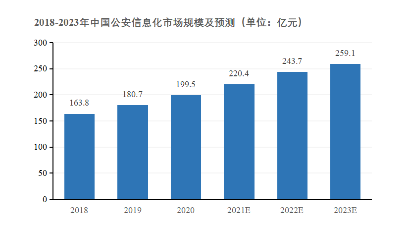 我國公安信息化行業(yè)已發(fā)展多年。至今,我國已完成“金盾”工程、“3111”工程、“平安城市”、“雪亮工程”等項目建設(shè),公安信息網(wǎng)各類基礎(chǔ)設(shè)施已基本建成,并提出“情指勤輿”一體化運行機制。其中,“情”指情報,即時感知異常風(fēng)險;“指”是指揮,承擔(dān)“信息高地”的職能;“勤”是勤務(wù),根據(jù)情報和任務(wù),快速行動;“輿”是輿情,實現(xiàn)網(wǎng)絡(luò)負(fù)面輿情的控制。四者全天候無縫銜接,一體化運作。近年來,我國公安信息化市場規(guī)模穩(wěn)步增長。據(jù)銳觀咨詢數(shù)據(jù)顯示,截至2020年,我國公安信息化市場規(guī)模達199.5億元,預(yù)計到2023年市場規(guī)模將高達259.1億元。