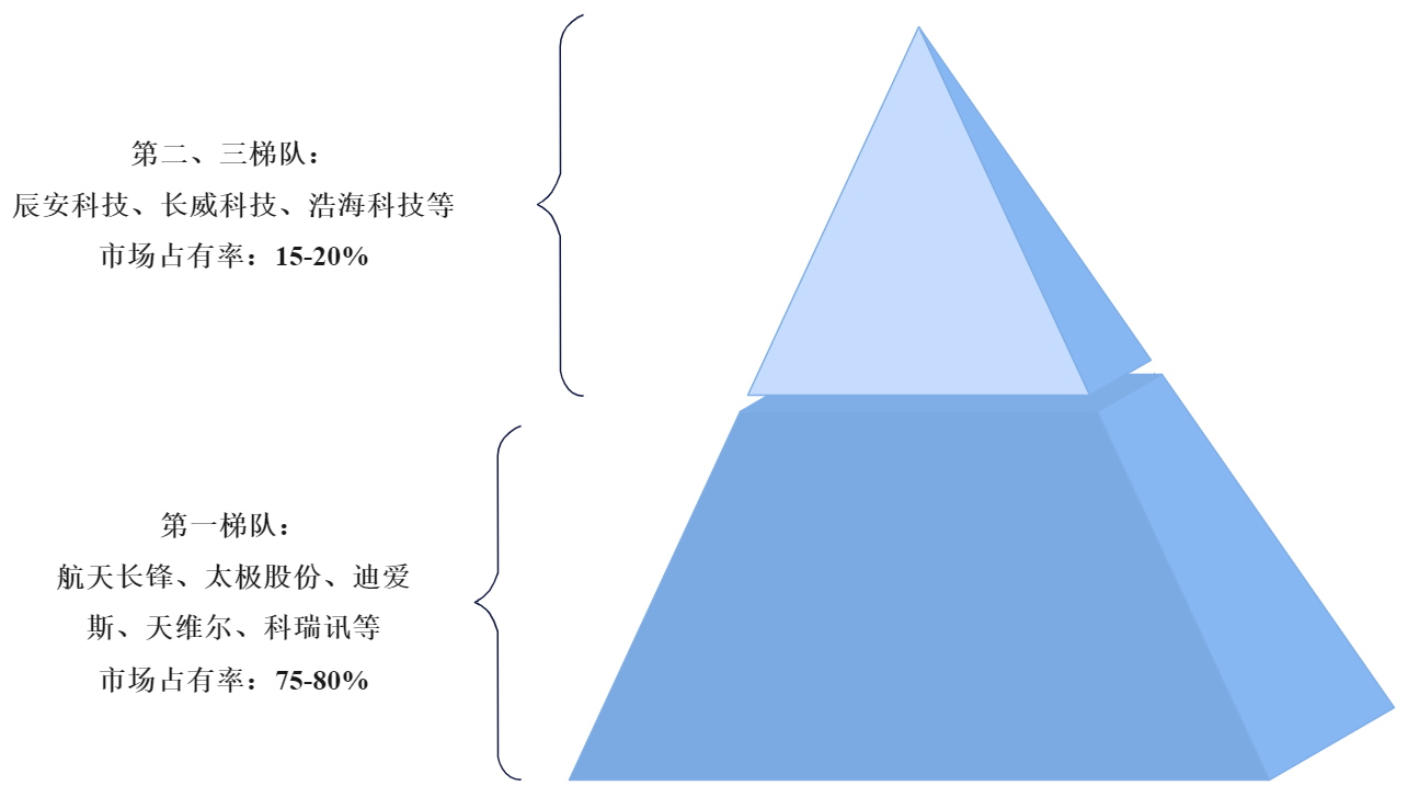 目前,在公安應(yīng)急指揮系統(tǒng)細(xì)分領(lǐng)域,根據(jù)企業(yè)經(jīng)營狀況、技術(shù)水平、客戶覆蓋程度等因素,迪愛斯、航天長鋒、太極股份等第一梯隊企業(yè)在行業(yè)內(nèi)部已具備明顯優(yōu)勢,市場占有率高達75-80%。
