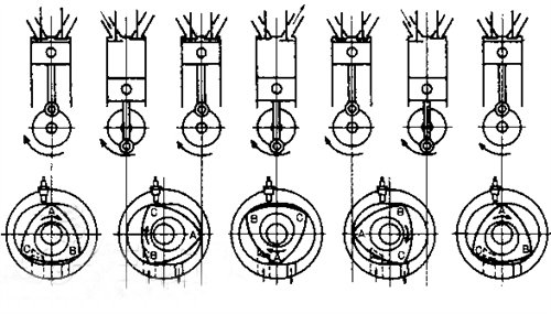 排氣沖程:三角轉(zhuǎn)子角頂C轉(zhuǎn)過排氣孔右側(cè)位置時,排氣沖程開始,最終三角轉(zhuǎn)子回到位置a,排氣沖程結(jié)束,轉(zhuǎn)子自轉(zhuǎn)360°(主軸轉(zhuǎn)三周),一個工作循環(huán)結(jié)束。同時,CA工作腔、AB工作腔也分別完成一個工作循環(huán)。