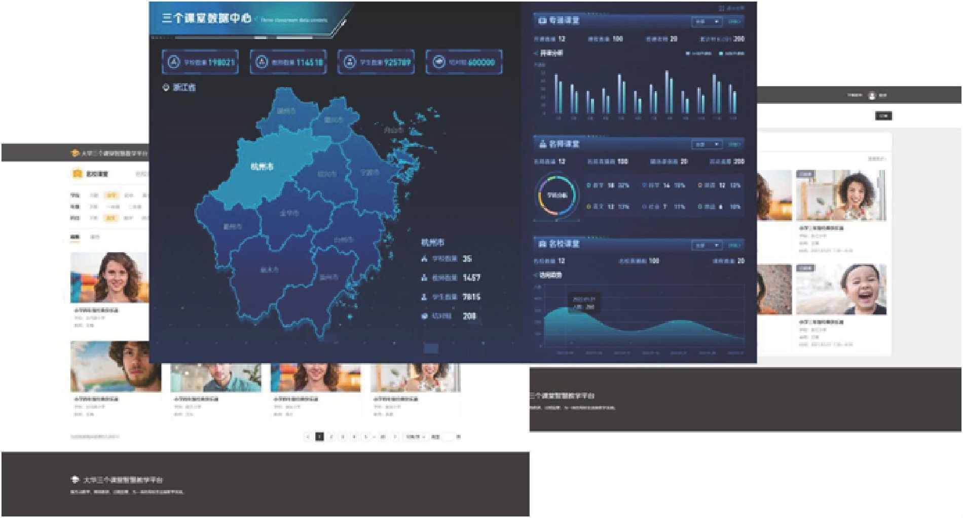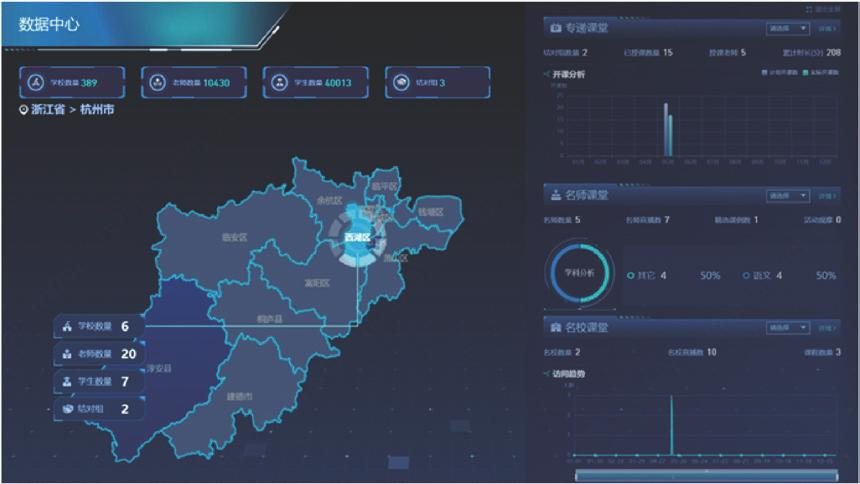 大華股份將所有名師、名課等資源全部匯總于統(tǒng)一的資源池中,利用數(shù)據(jù)看板功能,以地圖形式展示三個(gè)課堂工作情況概覽,方便管理者快速了解當(dāng)?shù)厝齻€(gè)課堂工作開通情況。而統(tǒng)計(jì)報(bào)表功能,還提供學(xué)校和老師三個(gè)課堂工作情況統(tǒng)計(jì)報(bào)表,方便管理者詳細(xì)了解各學(xué)校和老師的三個(gè)課堂參與情況。