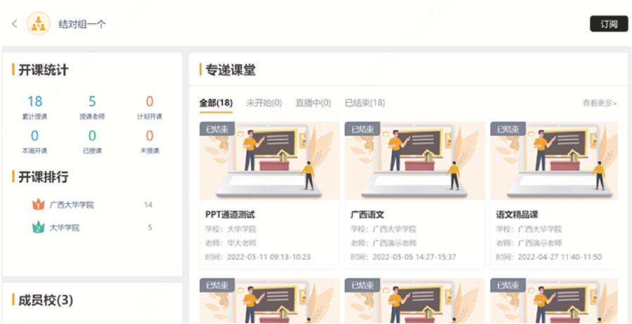 因此專遞課堂應(yīng)用打通了優(yōu)質(zhì)學(xué)校與薄弱學(xué)校結(jié)對(duì)幫扶的網(wǎng)絡(luò)結(jié)對(duì)空間與線下教學(xué)空間,實(shí)現(xiàn)了結(jié)對(duì)開課計(jì)劃、遠(yuǎn)程互動(dòng)教學(xué)、在線直播、回顧點(diǎn)播等應(yīng)用,區(qū)域則可以通過應(yīng)用平臺(tái)的開課地圖、開課課表和直播、點(diǎn)播等功能對(duì)專遞課堂落實(shí)情況進(jìn)行數(shù)據(jù)監(jiān)管和過程監(jiān)管,同時(shí)也能通過排行榜對(duì)積極開課的學(xué)校、老師進(jìn)行鼓勵(lì)或表彰,從而保障專遞課堂得到落實(shí),保障教育的基本均衡。