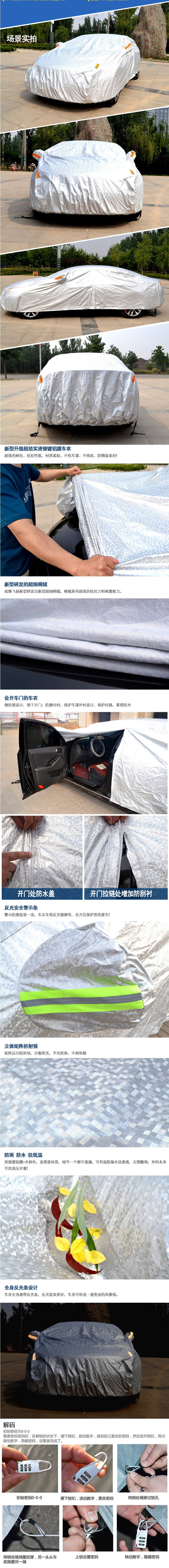 5、警示加鎖加厚鋁膜側(cè)開門帶反光條防盜車衣 背面加棉絨、有反光條、有密碼鎖、駕駛位置有拉鏈可以拉開。只有亮銀色