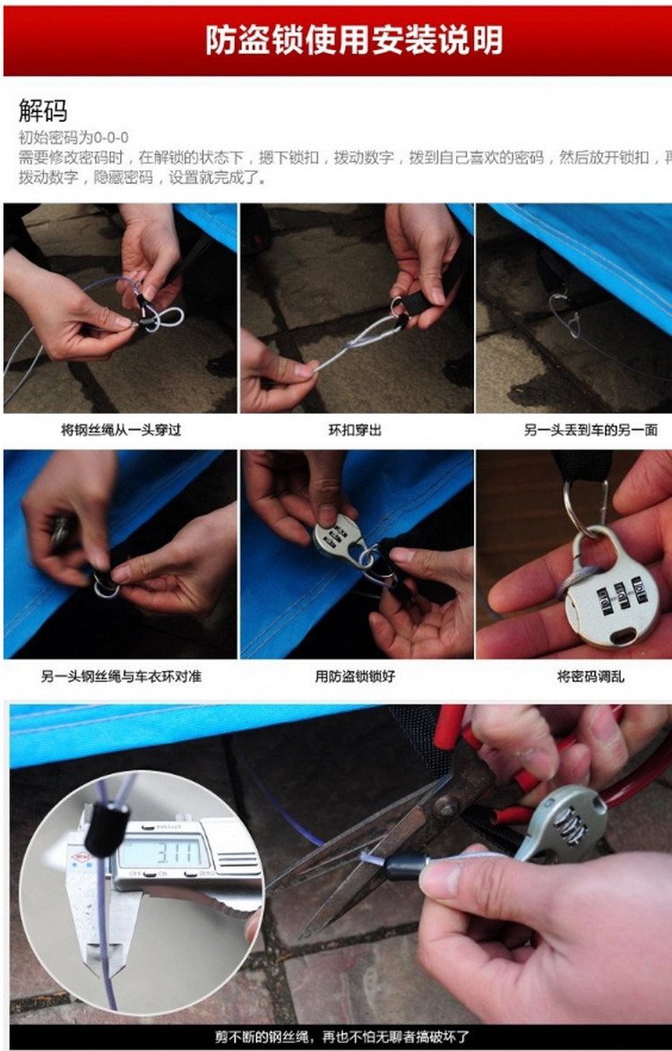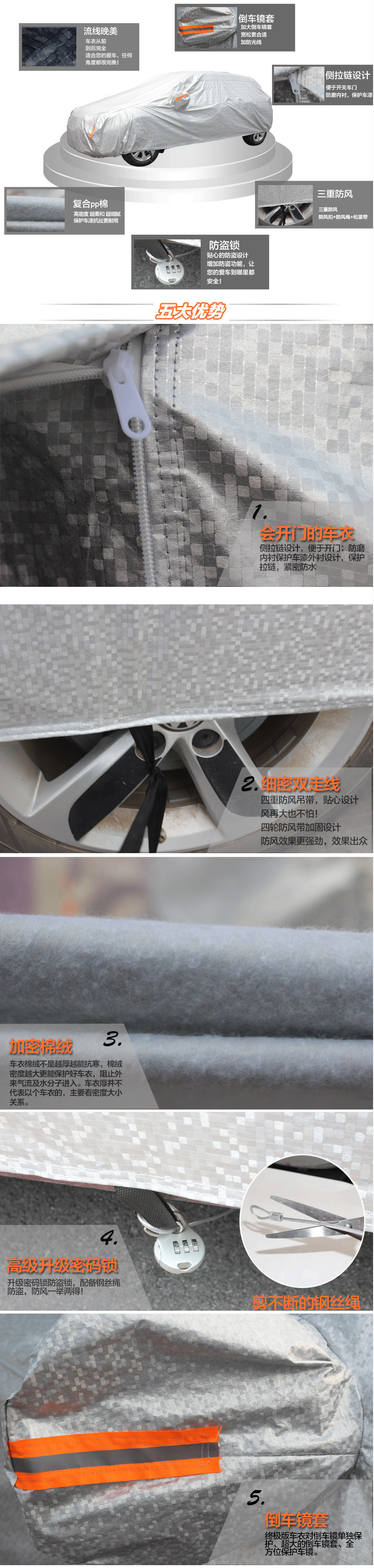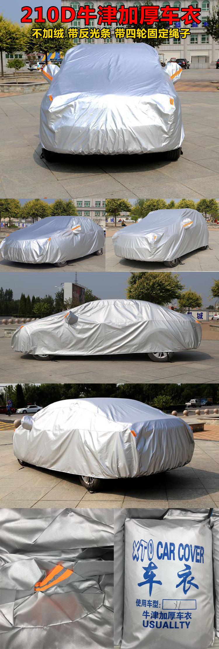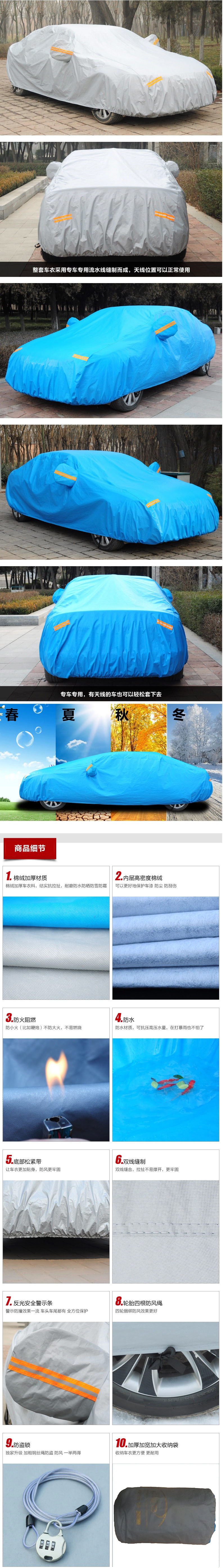 6、牛津布加棉車衣,采用牛津布材質(zhì),質(zhì)量非常耐用。帶反光條防盜車衣 背面加棉絨、有反光條、有密碼鎖、駕駛位置有拉鏈可以拉開。只有亮銀色