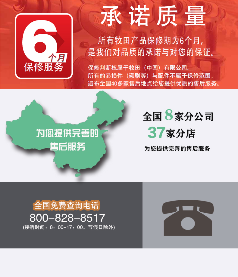我公司出售的整機均提供售后延保服務,親們可以放心購買。機器超出牧田售后維修期的,由我公司后期來服務。具體費用本公司會出具詳細的檢測維修報價,請放心采購,正規(guī)官方授權,公司承諾,所有售出商品,假一罰十。