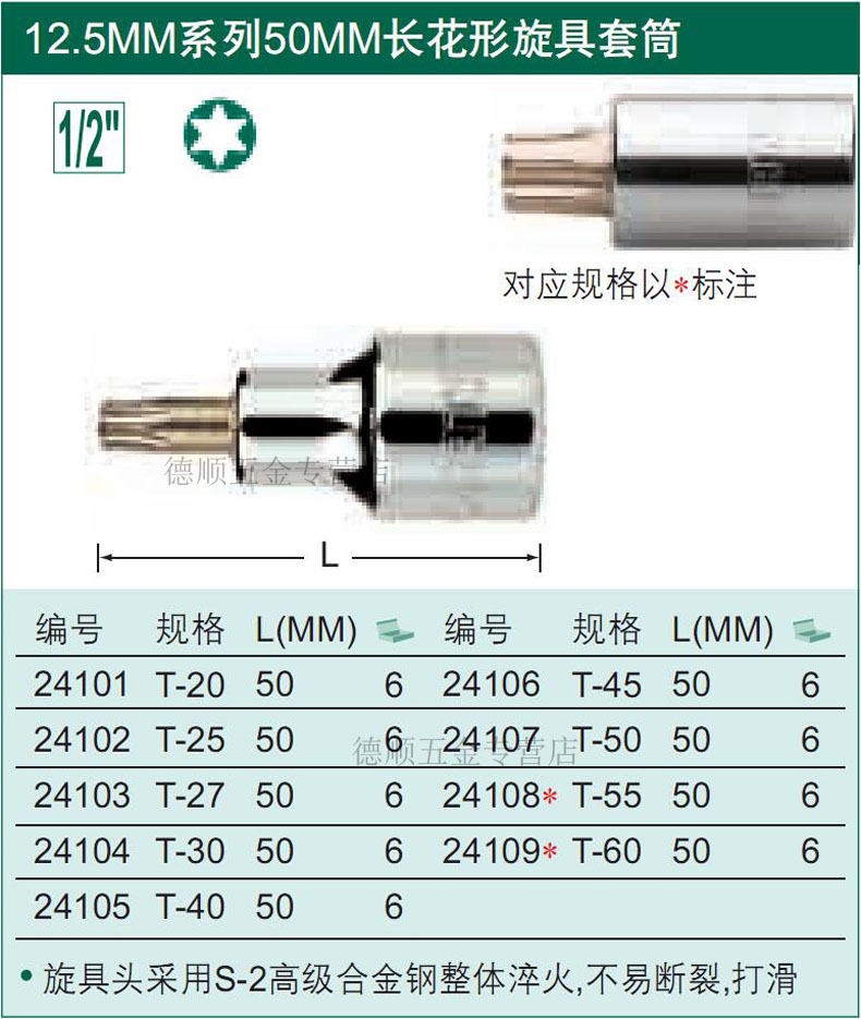 花形旋具套筒T20 24101,花形旋具套筒T25 24102,花形旋具套筒T27 24103,花形旋具套筒T30 24104,花形旋具套筒T40 24105,花形旋具套筒T45 24106,花形旋具套筒T50 24107,花形旋具套筒T55 24108,花形旋具套筒T60 24109