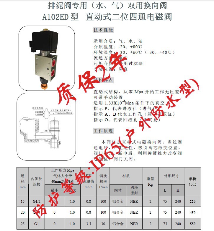 本閥門是直動式電磁換向閥,當線圈通電時,產(chǎn)生磁性,吸引閥芯改變位置,閥門打開。斷電后,利用彈簧推力改變閥芯復(fù)位,閥門關(guān)閉。