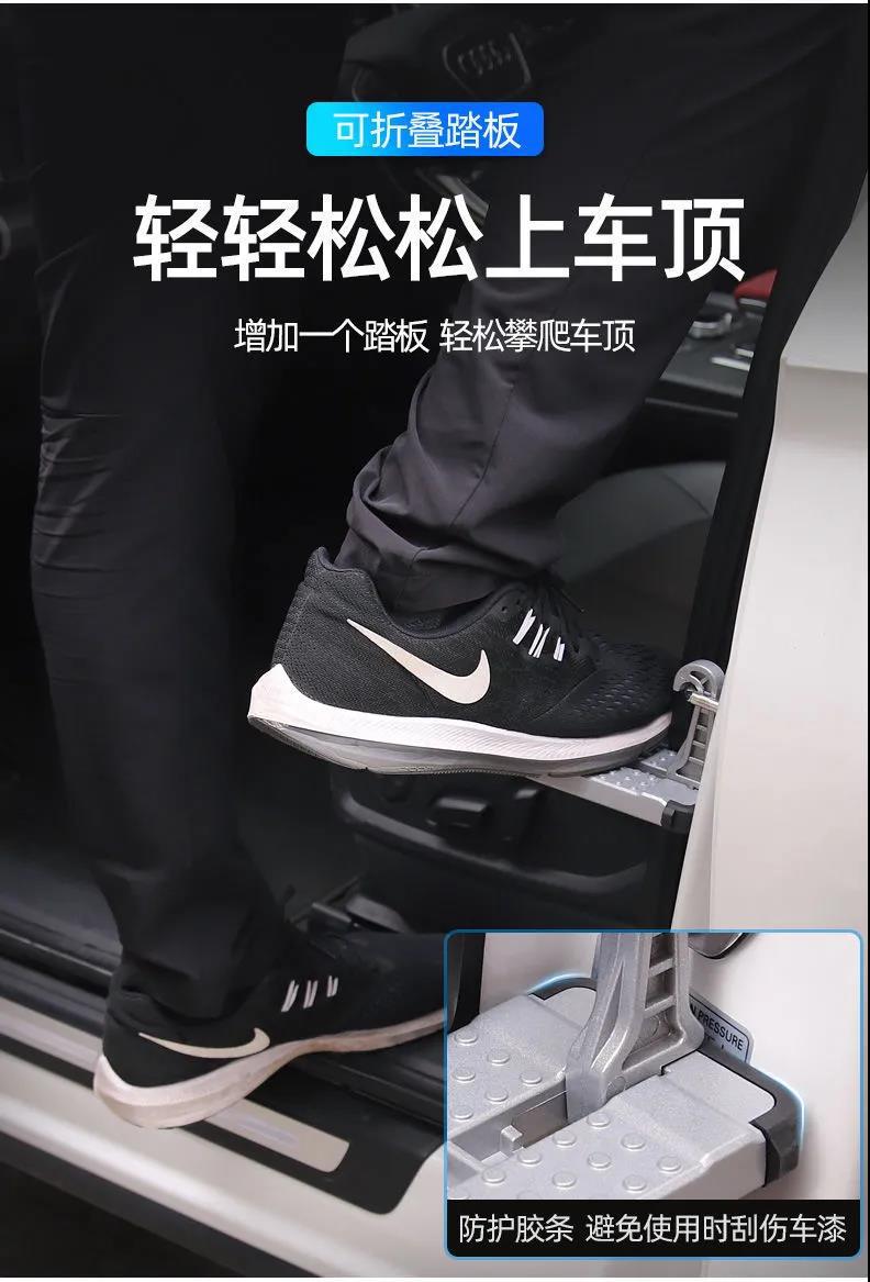 無釘款:所有車型都適用的車門掛鉤踏板,可以輕輕松松登上車頂放行李、清潔車頂、車頂打蠟??沙兄?00公斤。