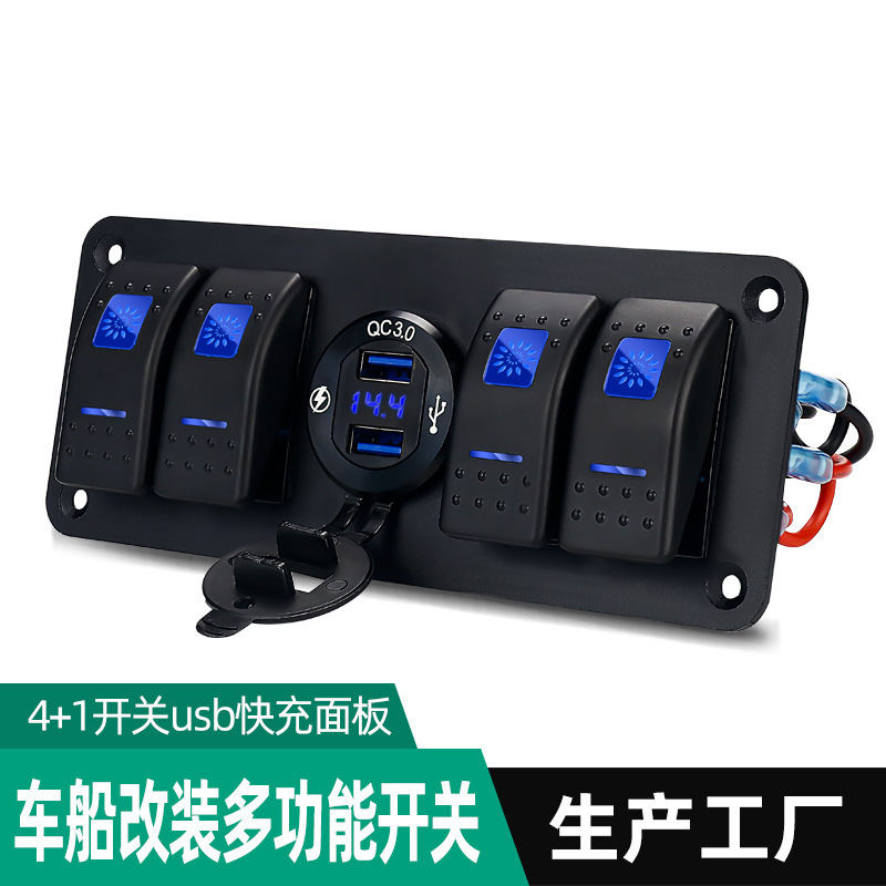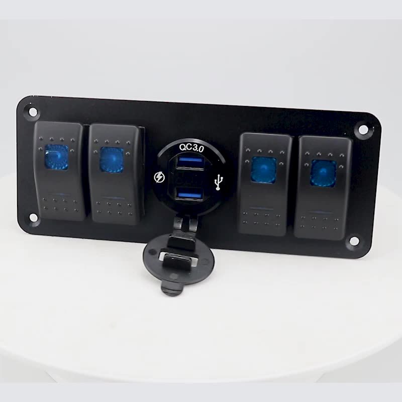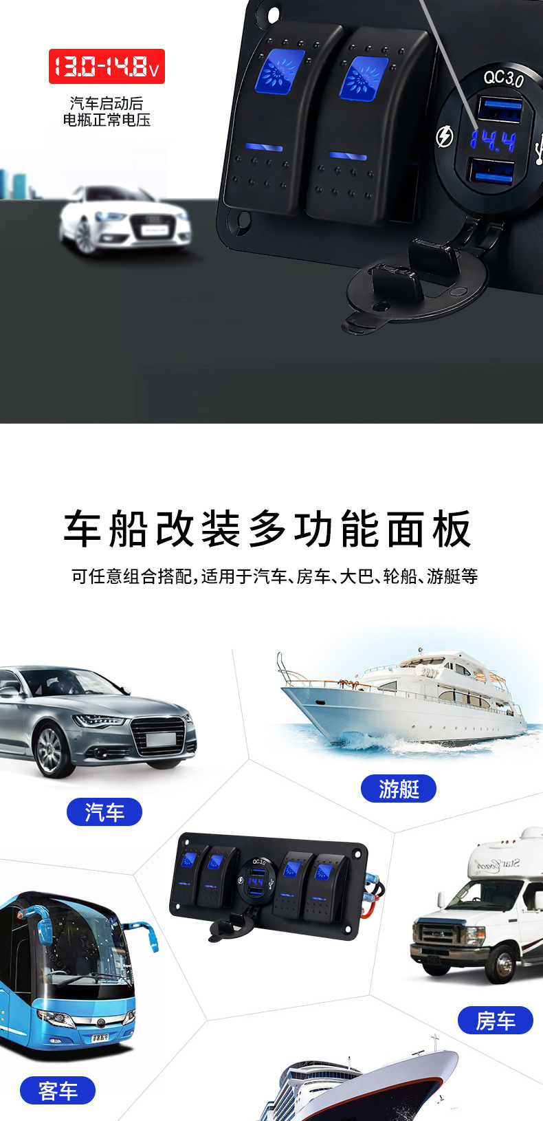 產(chǎn)品名稱:4組藍色LED指示燈開關+QC3.0金屬雙USB帶電壓表