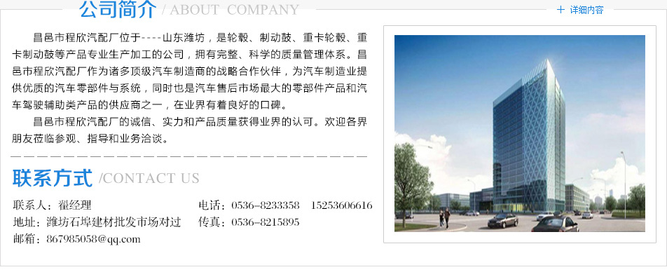 昌邑市程欣汽配廠位于----山東濰坊,是輪轂、制動(dòng)鼓、重卡輪轂、重卡制動(dòng)鼓等產(chǎn)品專業(yè)生產(chǎn)加工的公司,擁有完整、科學(xué)的質(zhì)量管理體系。昌邑市程欣汽配廠作為諸多汽車制造商的戰(zhàn)略合作伙伴,為汽車制造業(yè)提供的汽車零部件與系統(tǒng),同時(shí)也是汽車售后市場(chǎng)專業(yè)的零部件產(chǎn)品和汽車駕駛輔助類產(chǎn)品的供應(yīng)商之一,在業(yè)界有著良好的口碑。昌邑市程欣汽配廠的誠(chéng)信、實(shí)力和產(chǎn)品質(zhì)量獲得業(yè)界的認(rèn)可。歡迎各界朋友蒞臨參觀、指導(dǎo)和業(yè)務(wù)洽談。