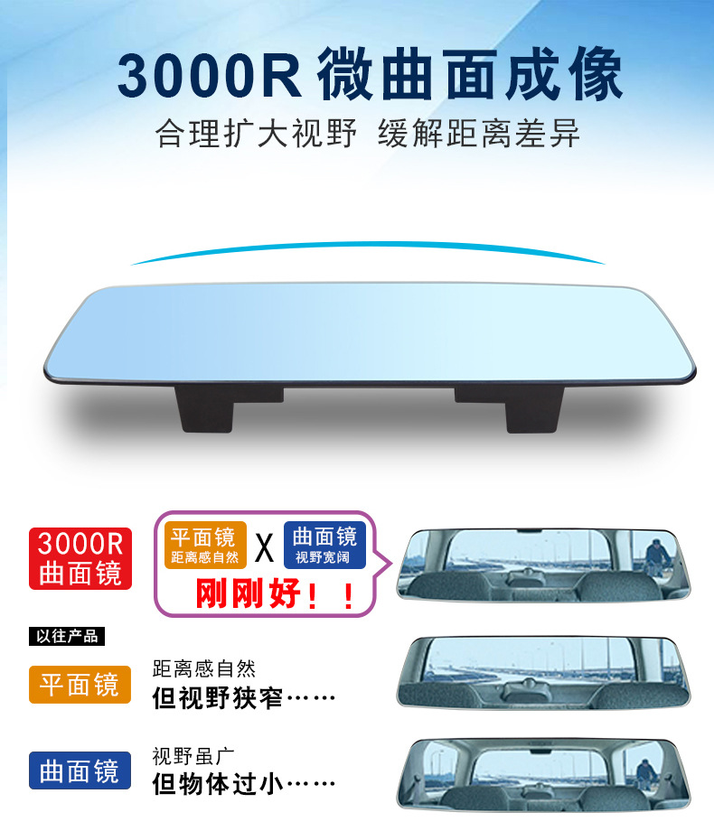 1.采用3000R微曲率鏡片,能合理擴(kuò)大視野范圍,提升行車安全。