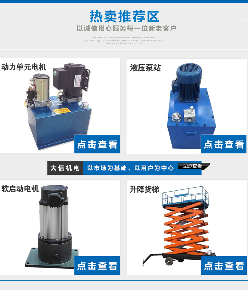 公司是動力單元、液壓泵站、液壓電機、起重機電機等產(chǎn)品生產(chǎn)加工的公司。公司在全國各地均設有銷售代理,公司產(chǎn)品覆蓋全國。“以科學的管理,優(yōu)良的技術(shù),優(yōu)良的服務,打造精致的產(chǎn)品”是我們公司的質(zhì)量方針。我們愿以優(yōu)良的產(chǎn)品和優(yōu)良的服務與各界朋友攜手合作,共創(chuàng)美好的明天。