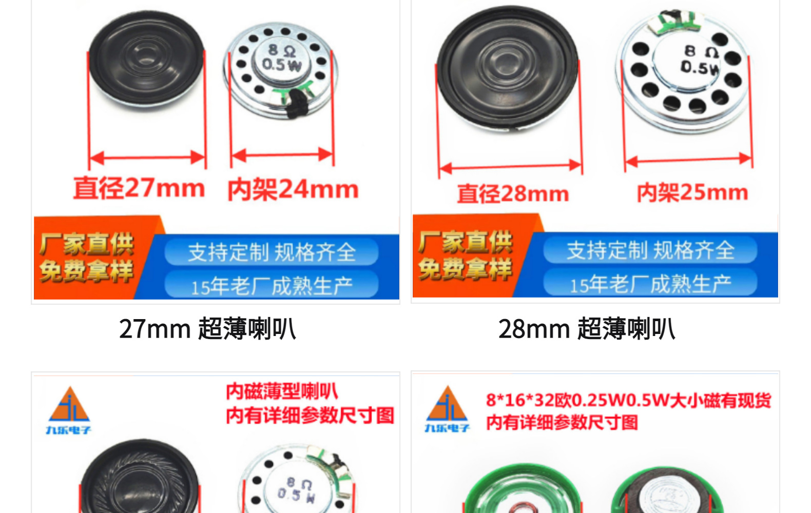 腔體喇叭(5) 電子煙咪頭(1) 橢圓形喇叭(3) 圓形內(nèi)外磁喇叭(67) 長方形內(nèi)外磁喇叭(15) 方形內(nèi)外磁喇叭(24) 防水喇叭(3) 耳機小喇叭(14) 有源一體分體蜂鳴器(4)