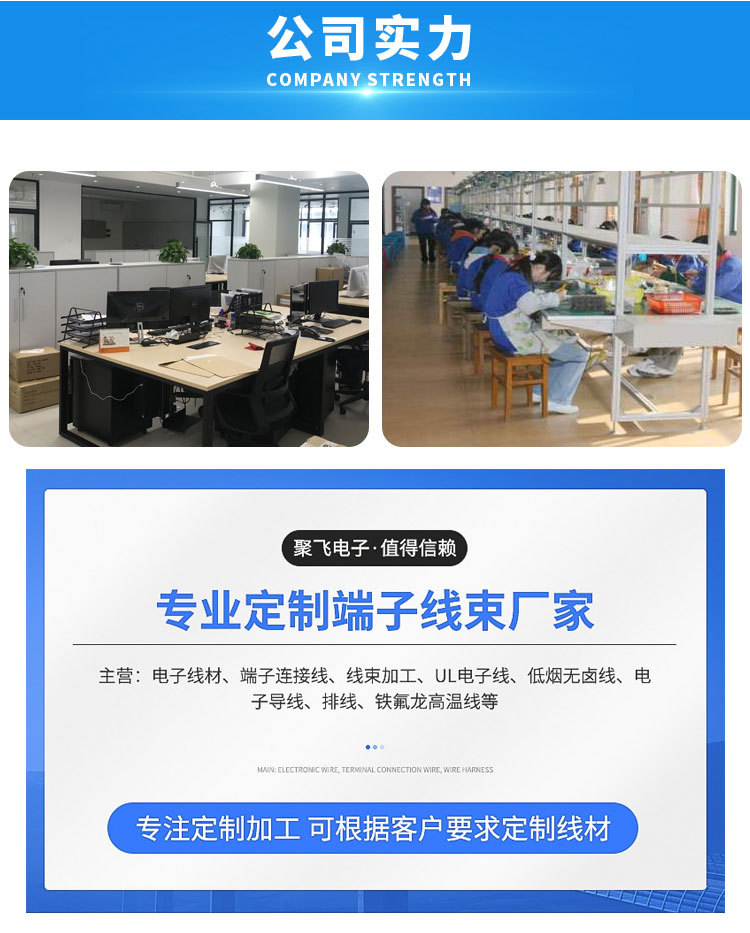 二十年專注于端子線定制,端子線加工,電子線定制,電子線加工,生產(chǎn)電子線材,低煙無鹵電子線,透明電子線,排線,高溫線,硅膠線,鐵氟龍線材等